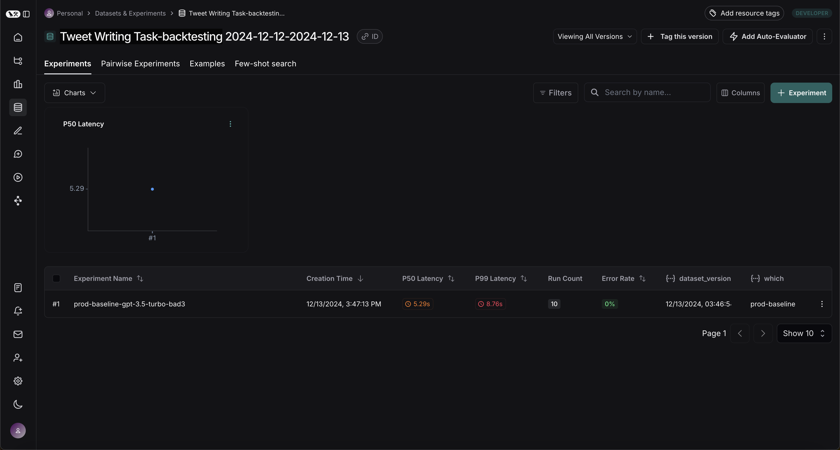 完成此步骤后,您应该在 LangSmith 项目中看到一个名为“推文编写任务-回溯测试 TODAY'S DATE”的新数据集,其中包含一个实验,如下所示: